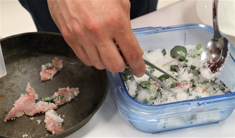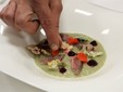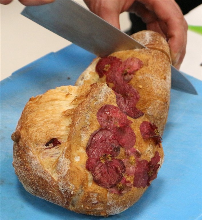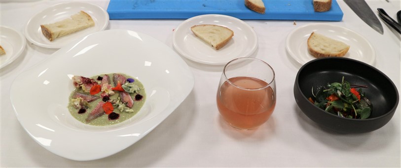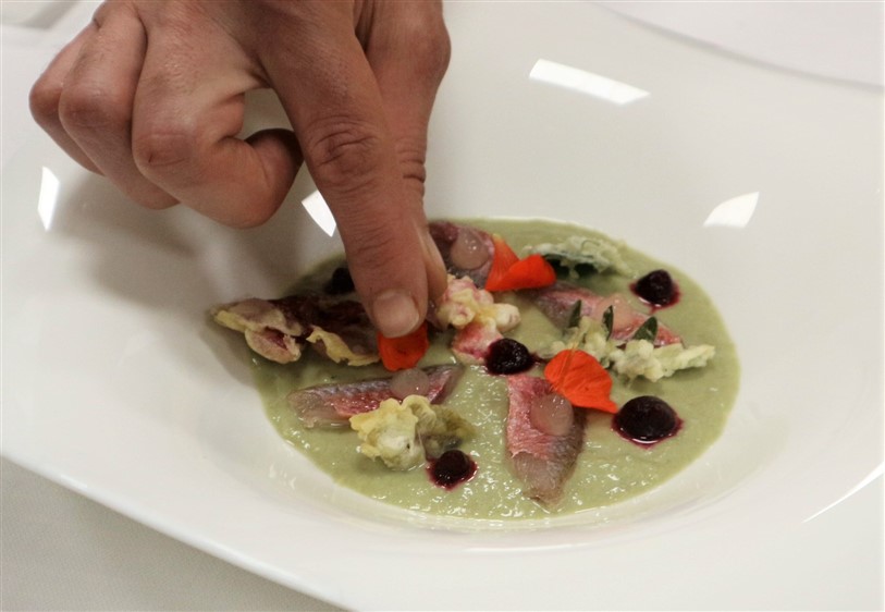 Lo chef Federico Scardina dell’Hostaria del Viale di Albenga ieri ha presentato un interessante piatto dove i fiori sono stati utilizzati e presentati in diverse consistenze e preparazioni. “L’asparago viola incontra i fiori” la preparazione presentata al pubblico prevedeva dei filetti di triglia marinati con un mix di fiori ed erbe particolari come l’erba ostrica, l’erba formaggio e l’origano cubano, su crema di asparagi viola d’Albenga con nasturzio, fiori fritti, gel di limone e barbabietola con pane lievitato con fiori di begonia, insalata di petali e un the ottenuto a freddo con una miscela di diversi fiori.