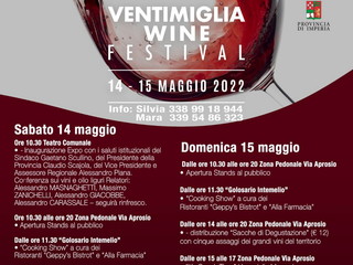 L’appuntamento con il Ventimiglia Wine Festival avrà inizio alle ore 10 di sabato14, con l’apertura degli stand espositivi dei prodotti locali nella zona pedonale di via Aprosio, per concludersi alle 20 di domenica 15.