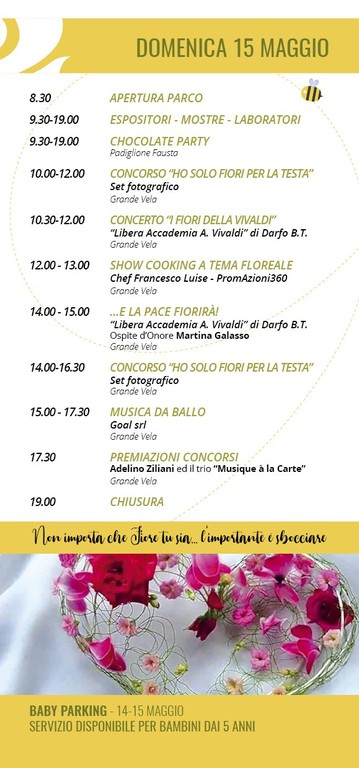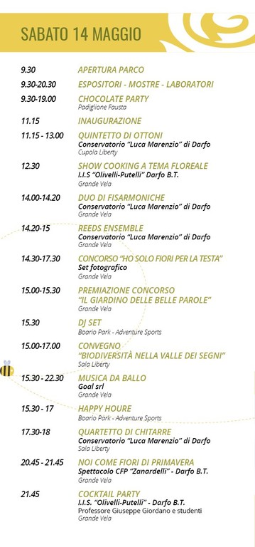 L'undicesima edizione della rassegna, organizzata da Loretta Tabarini di PromAzioni360 per l'Amministrazione comunale di Darfo, sarà come sempre dedicata al florovivaismo, ma non solo. Perchè agli stand allestiti nel parco farà da cornice un programma ricco e articolato di spettacoli, laboratori creativi, musica, giochi, sfilate, concorsi, show cooking. In programma sabato pomeriggio anche un importante convegno sulla biodiversità e l'unicità del territorio camuno, con la partecipazione del naturalista Enzo Bona e dei biologi Anna Maria Bonettini e Dario Furlanetto.