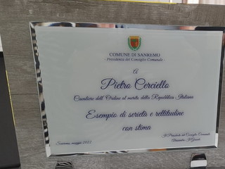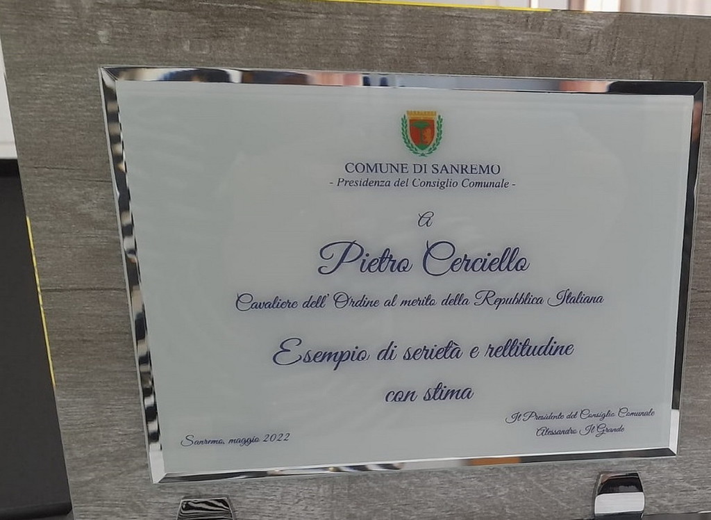 Il presidente Il Grande ha voluto rendere omaggio al Cavaliere Cerciello, luogotenente in quiescenza della Guardia di Finanza e già Comandante della Brigata Guardia di Finanza di Santo Stefano al Mare, con una targa della Presidenza del Consiglio comunale.