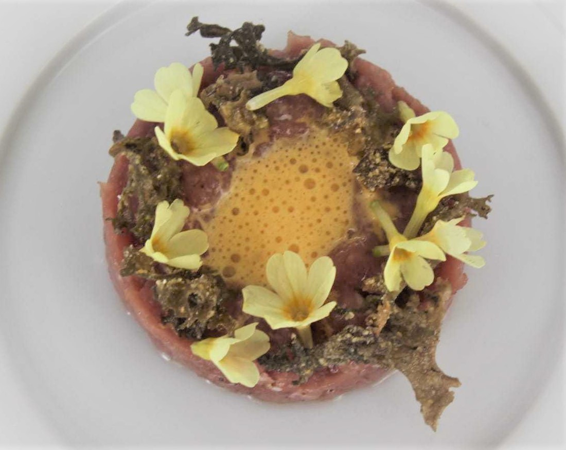 1) antipasto: Tartare di capretto, spuma al tuorlo, lichene, primule e aceto al sambuco del ristorante Al Resù di Lozio