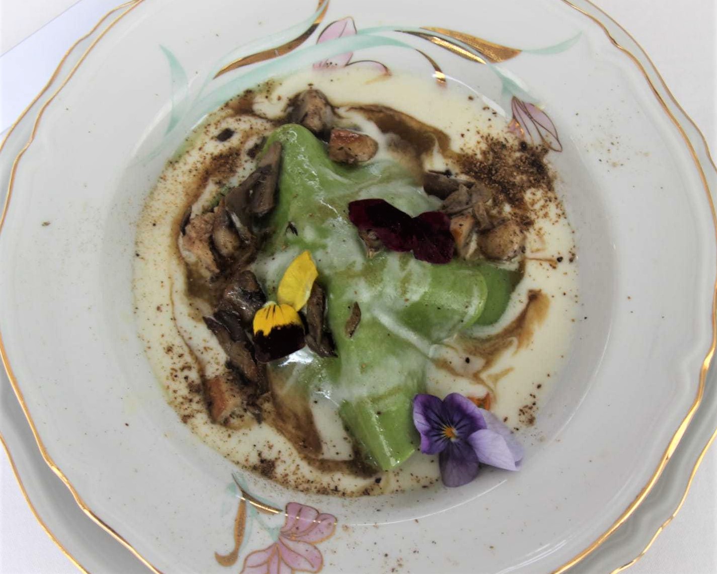 2) primo piatto: Raviolo aperto pulled pork con crema Silter e ristretto alla birra e funghi del ristorante La Curt di Pisogne