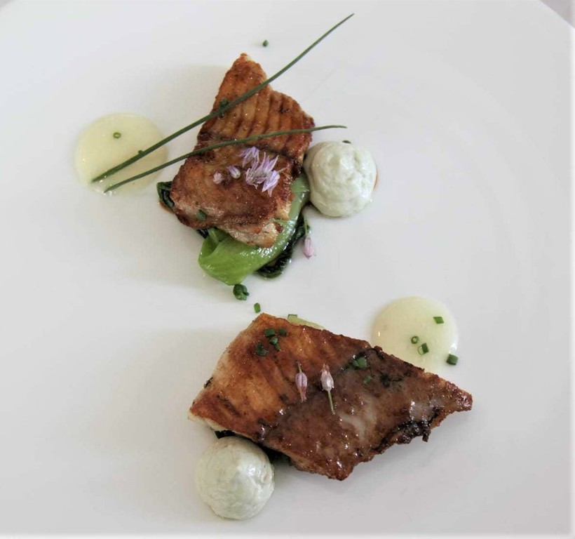 3) secondo piatto: Anguilla alla birra camuna, pak choi e fiori di erba cipollina del ristorante Bella Iseo di Iseo
