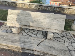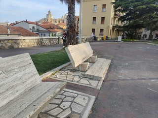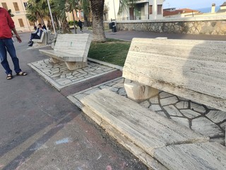 Imperia, panchina di marmo distrutta dai vandali ai giardini di piazza Roma a Porto Maurizio (foto)