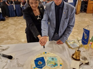 Segue lo scambio rituale dei guidoncini, e con un sincero applauso di benvenuto ai neo soci, fa il suo ingresso un splendida torta decorata con l’effige dei due clubs! Viene donata alla presidente una bella coccarda con i colori del lions molto gradita e che rappresenta un punto in comune tra di noi al momento dei meeting prossimi!