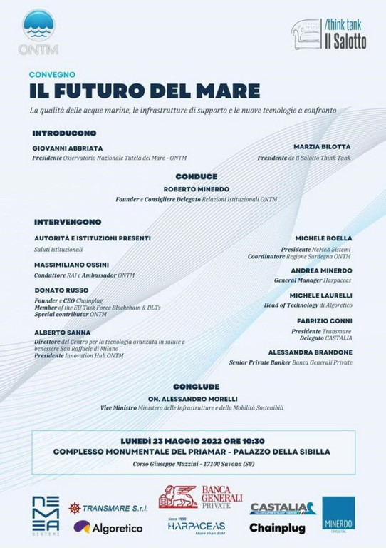 Domani, lunedì 23 maggio, a partire dalle ore 10.30, si svolgerà presso il complesso monumentale del Priamar - Palazzo della Sibilla di Savona, il convegno ‘Il Futuro del Mare’, organizzato dall’Osservatorio Nazionale per la Tutela del Mare (ONTM) in collaborazione con Il Salotto Think Tank.