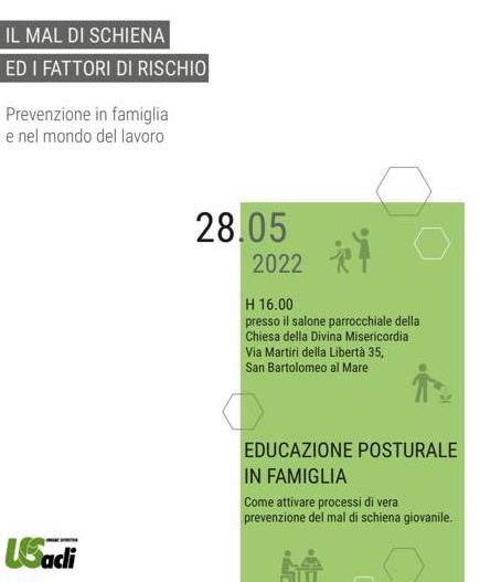 'Il mal di schiena e i fattori di rischio, prevenzione in famiglia e nel mondo del lavoro' è il titolo della conferenza che si tiene oggi, sabato 28 maggio, alle ore 16 presso il salone parrocchiale della Chiesa della Divina Misericordia in via Martiri della Libertà 35 a San Bartolomeo al Mare.