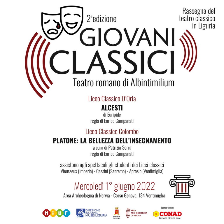 Mercoledì 1° giugno, presso il teatro romano di Abintimilium, all’interno dell’Area archeologica di Nervia a Ventimiglia si svolgerà la seconda edizione di Giovani Classici – Rassegna del teatro classico in Liguria. Dopo due anni di attesa, 200 allievi di diverse scuole secondarie della Regione 'invaderanno' gli antichi resti della città romana di confine, per dare vita, sia come interpreti che come spettatori, ad una memorabile giornata di spettacolo e cultura.