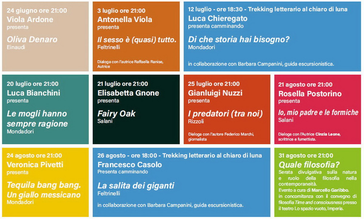 Dal 24 giugno al 31 agosto sono previsti dieci incontri con l'autore a due passi dal bel mare di Ponente, a Diano Marina per chiacchierare scoprendo storie ed entrando nel laboratorio dello scrittore. Il programma dell’edizione 2022 si contraddistingue per la sua versatilità, offrendo un ventaglio di proposte e incontri adatti a ogni pubblico. Ci saranno infatti romanzi di narrativa ma anche storia gialla, testimonianze di vita, saggi d'attualità, incontri per ragazzi e due speciali serate che omaggeranno il plenilunio con un trekking tra bellezze del territorio e magia della narrazione, con la guida certificate Barbara Campanini.