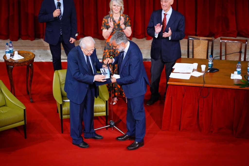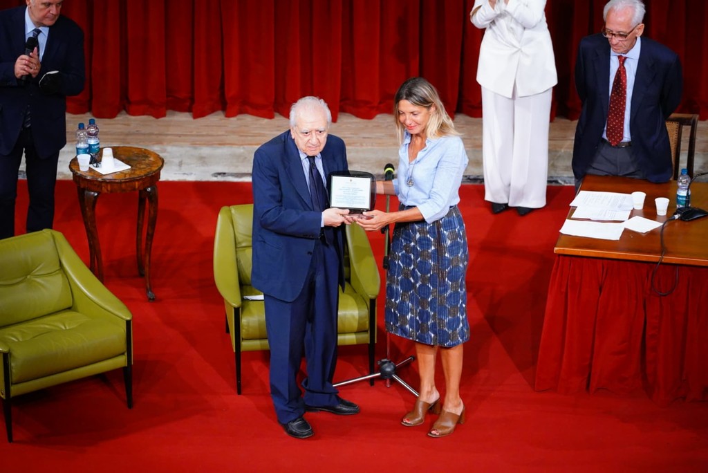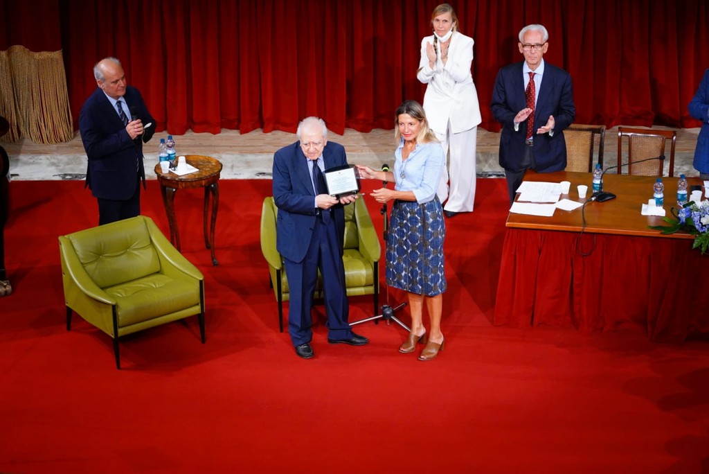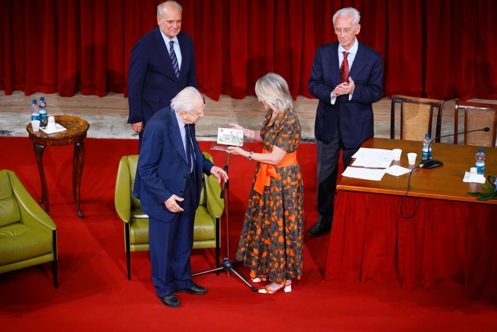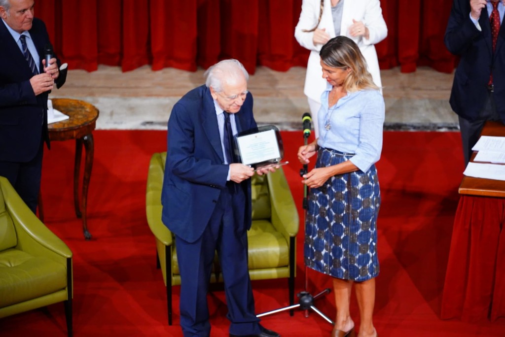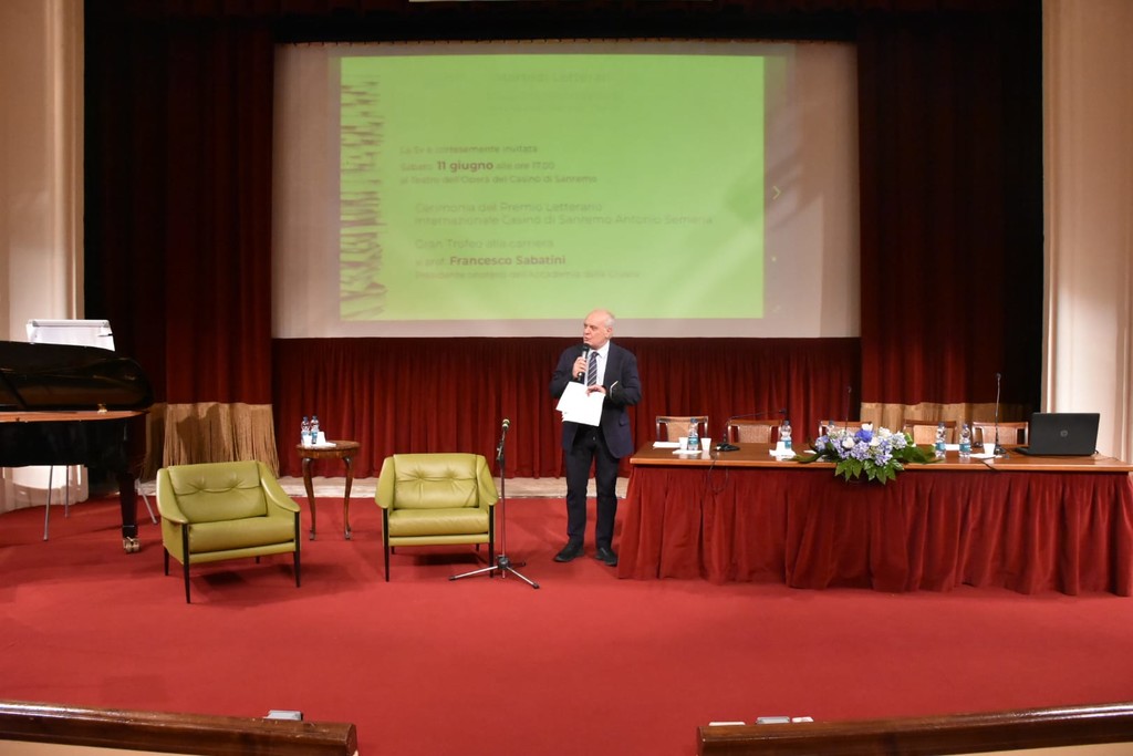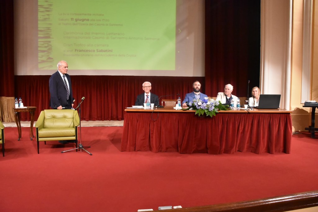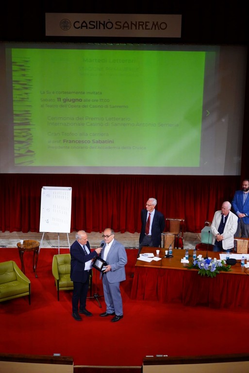 Premio alla carriera, oggi pomeriggio al Teatro del Casinò di Sanremo per il Prof. Francesco Sabatini, linguista, filologo e lessicografo italiano, presidente onorario dell'Accademia della Crusca, di cui è stato presidente dal 2000 al 2008, e professore emerito dell'Università degli studi Roma Tre. Il riconoscimento è stato assegnato nell'ambito del Premio Letterario Internazionale Casinò di Sanremo 'Antonio Semeria' che ha scelto le terne finaliste che si presentano davanti alla Giuria popolare e successivamente verrà decretata la classifica finale.