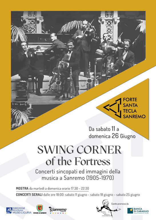 “Swing Corner of the Fortress” inaugura sabato 11 giugno al Forte Santa Tecla di Sanremo: l’iniziativa comprende una rassegna concertistica e una mostra di fotografie e reperti della storia musicale sanremese, oltre alla presentazione di due nuove pubblicazioni. Proposta dal Centro Studi Musicali “Stan Kenton”, è realizzata grazie al supporto di Banca di Caraglio.