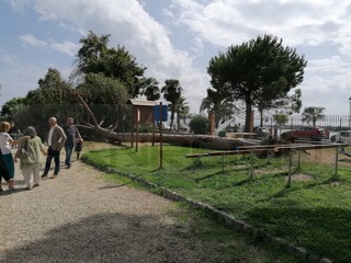 Il pino è crollato in pochi secondi e ha sfiorato una panchina dove era seduta una donna, rimasta sotto choc.