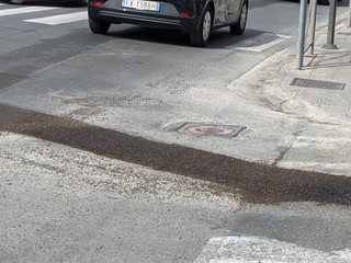 Asfalto di pessima qualità quello utilizzato per la copertura dei recenti lavori di scavo all'incrocio tra via Verdi e piazza Cesare Battisti a Sanremo.