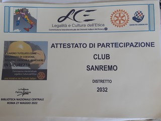 La Settimana scorsa presso L'Hotel Paradiso di Sanremo lo studente del Liceo Classico Cassini di Sanremo Leonardo Pistocchi, vincitore del secondo premio indetto dal Rotary - XI Concorso della commissione interdistrettuale 'Legalità e cultura dell'etica', ha relazionato sulla sua tesi: ‘Lavoro costituzionalmente tutelato come strumento di coesione e sviluppo delle comunità e garanzia di crescita futura e di benessere. vecchie e nuove formule, formazione, sicurezza, inclusione e parità’