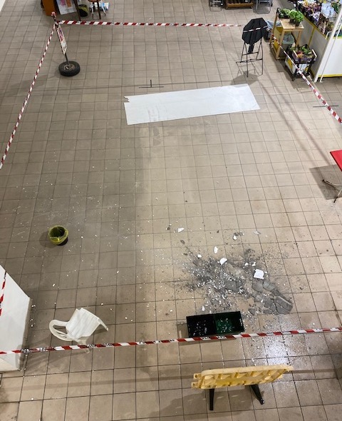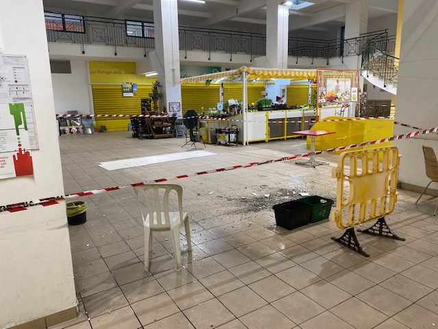 Pericolo al mercato coperto di Bordighera. Per via di una infiltrazione d'acqua una porzione di intonaco del soffitto è crollata a terra; per fortuna in quel momento nessuno si trovava nell'area interessata.