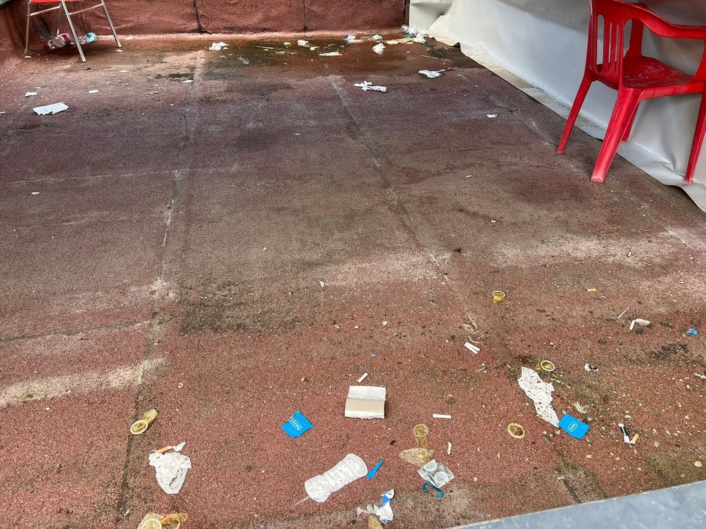 Decine di preservativi usati disseminati sul pavimento, indumenti intimi femminili a bordo piscina, bottiglie di alcolici rovesciate, resti di gelati, merendine, patatine.