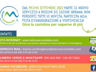 Il 14 luglio presso l’isola pedonale sita in via Ruffini a Ventimiglia, dalle ore 17.00 alle ore 20.00, si terrà la festa d'inaugurazione del nuovo servizio di igiene urbana per il Bacino Ventimigliese.