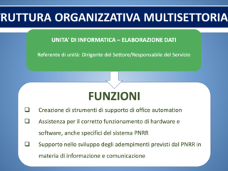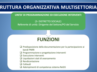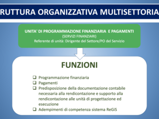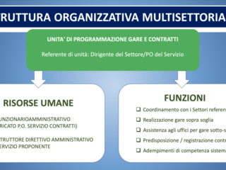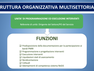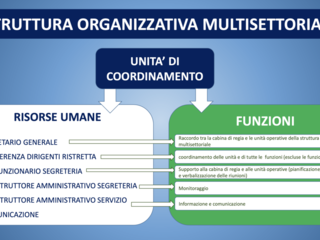 La struttura organizzativa multisettoriale è composta da: una unità di coordinamento, una unità di programmazione finanziaria e pagamenti, una unità di programmazione ed esecuzione interventi per ciascuna missione, una unità di programmazione gare e contratti, una unità di informatica elaborazione dati e una unità di verifiche e controllo amministrativo/contabile e legalità.