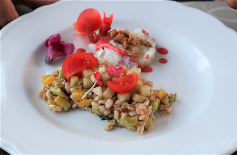 Insalata di Farro con Orticello di verdure e fiori misti; Tartare di Merluzzo alla Begonia;