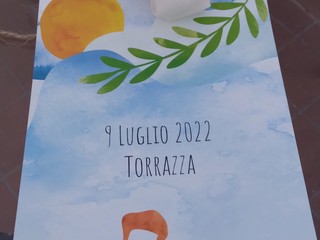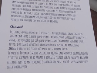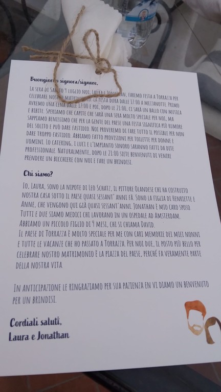 “Chi siamo? Io laura nipote di Leo Shatz, il pittore olandese che ha costruito la nostra casa sotto il paese quasi 60 anni fa. Sono la figlia di Henriette e Anne, che vengono qui già da 60 anni. Jonathan è il mio caro sposo. Tutti e due siamo medici che lavoriamo in un ospedale di Amsterdam. Abbiamo un piccolo figlio di 9 mesi che si chiama David. Il paese di Torrazza è molto speciale per me, con care memorie dei miei nonni e tutte le vacanze che ho passato a Torrazza. Per noi due il posto più bello per celebrare il nostro matrimonio è la piazza del paese perché fa veramente parte della nostra vista. Vi ringraziamo in anticipo per la vostra pazienza e vi diamo il benvenuto per un brindisi”.