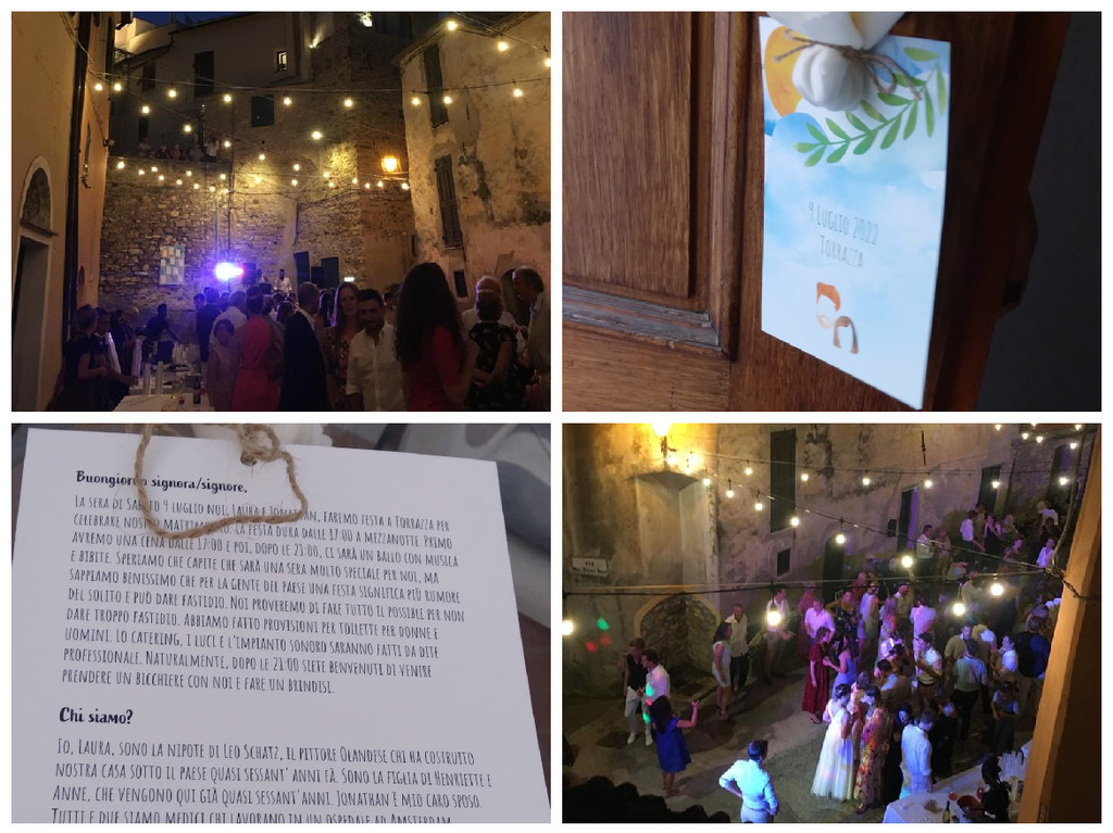 Nelle foto tratte dal gruppo Facebook 'VivImperia' alcuni momenti della serata. Ecco il testo della lettera affisso alle porte di tutte le case del paese: “La sera di sabato 9 luglio, noi Laura e Jonathan faremo festa a Torrazza per celebrare il nostro matrimonio. La festa dura dalle 17 a mezzanotte. Prima avremo una cena dalle 17 e poi, dopo le 21 ci sarà un ballo con musica e bibite. Speriamo che capiate che sarà una sera molto speciale per noi. Ma sappiamo benissimo che per la gente del paese una festa significa più rumore del solito e può dare fastidio. Noi proveremo a fare di tutto il possibile per non dare troppo fastidio…. Dopo le 21 siete i benvenuti a prendere un bicchiere con noi e fare un brindisi”.