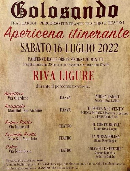 21.30. ‘Golosando tra i Carugi’: apericena itinerante tra Danza e Teatro. Vie e Piazze cittadine (locandina)