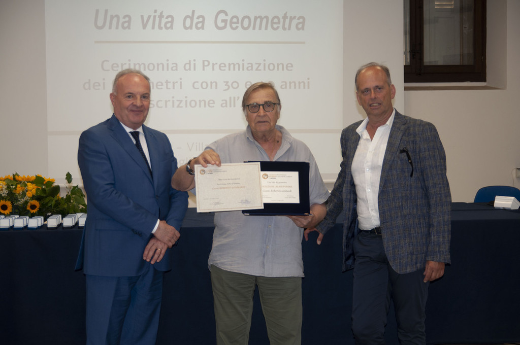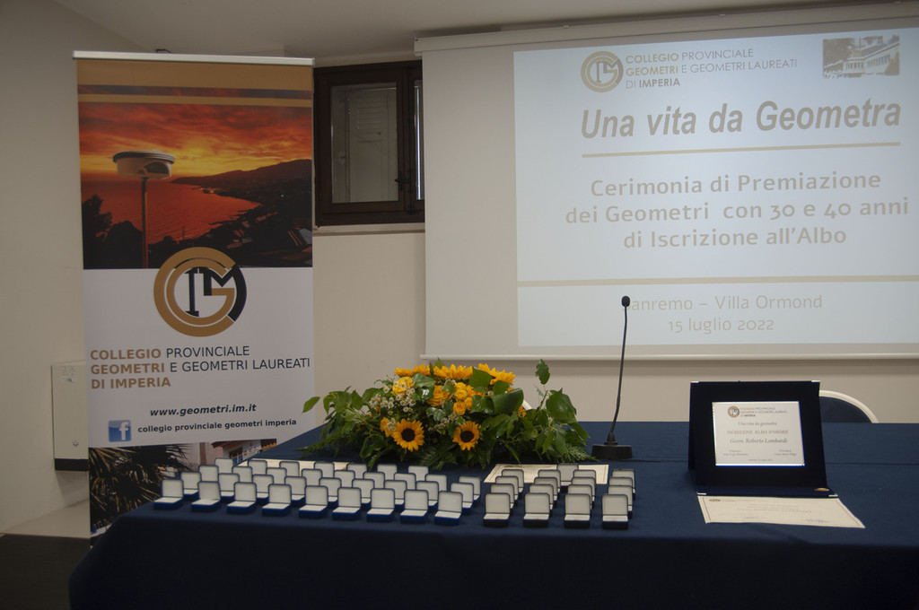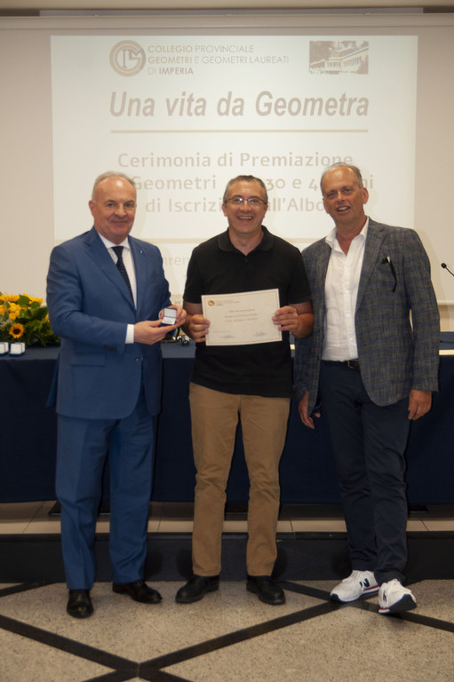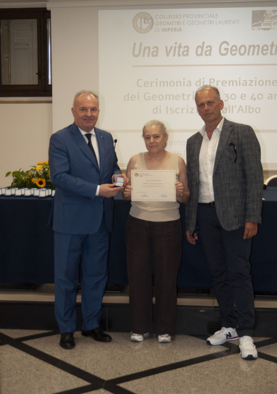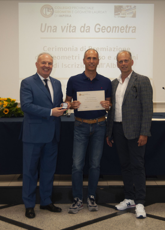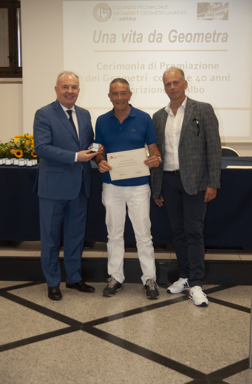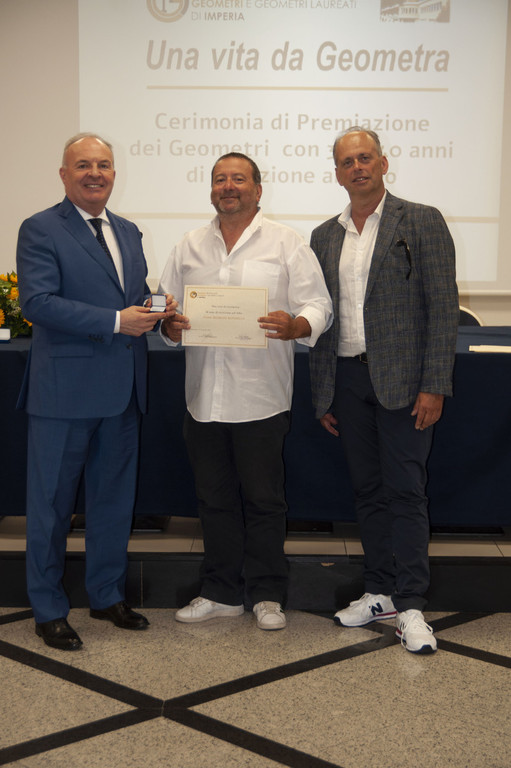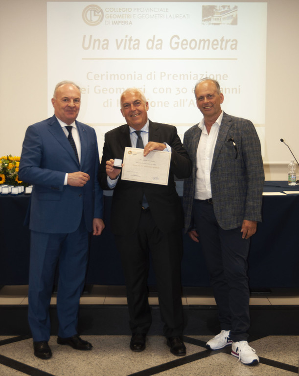 Un riconoscimento speciale è stato consegnato al geom. Roberto Lombardi per i suoi 50 anni di carriera professionale certificati inoltre con l’iscrizione all’Albo d’Onore del Collegio Provinciale di Imperia. Sono stati premiati con la medaglia d’oro per i 40 anni di professione i geometri:Giovanni Badano, Claudio Bico, Vincenzo Camellino, Marco Filippi, Agostino Gandalino, Felice Antonio Marini, Massimo Perego, Antonino Perrone e Marco Richermo.