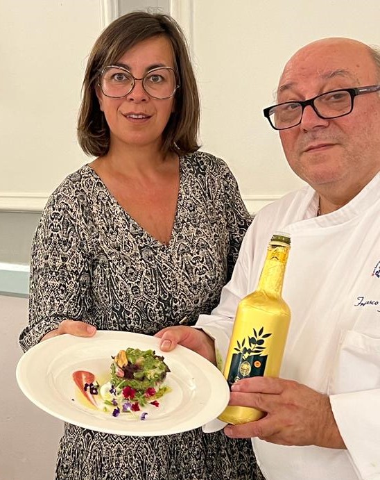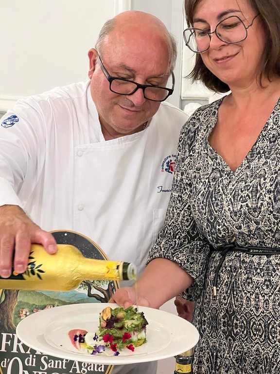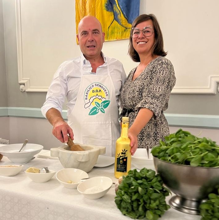 La serata si è svolta nella elegante cornice dell’Hotel des Anglais di Sanremo ed è iniziata con Flavio Corazza, ambasciatore del pesto al mortaio, che ha coinvolto gli ospiti, italiani e stranieri, nell’arte del pestello e del mortaio realizzando deliziose salse al mortaio, fra cui il pesto, testimonial della cucina ligure nel mondo. Con lui era presente Paolo Calcagno, titolare azienda agricola a conduzione familiare impegnata dal 1984 nella coltivazione del tipico basilico genoves. Selfie e foto con tradizionale bouquet di basilico hanno caratterizzato questo profumato momento della serata. Il percorso sensoriale è proseguito con un tasting sull’olio EVO Dop della Riviera Ligure con Serena Mela del Frantoio Sant’Agata di Oneglia, che è stato servito sul Cappon magro dello executive chef Francesco Impieri. Questo piatto è stato impreziosito anche dai fiori eduli e il ketchup di Begonia di Tastee - RAVERABIO di Albenga, un nuovo prodotto che sta conquistando rapidamente molti consensi fra gli chef del Ponente ligure. Il menu è proseguito poi con le trofiette al pesto, direttamente da mortaio di Fabio Corazza, abbinate al Pigato della riviera ligure della cantina Tenuta Maffone, con una degustazione didattica, curata dalla produttrice Eliana Maffone, che ha introdotto i commensali nel percorso di Vinificazione con criomacerazione, bâtonnage e barrique. Il tortino di acciughe del mar Ligure ha degnamente terminato il percorso sensoriale della dinner experience, dedicata ai sapori e ai profumi della Liguria, coordinata dal direttore del Des Anglais Paolo Madonia, dal maitre Antonino Profeta e dagli chef Felice Munafò eFrancesco Impieri.