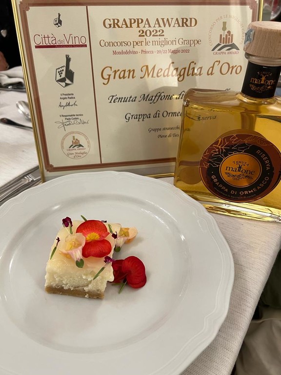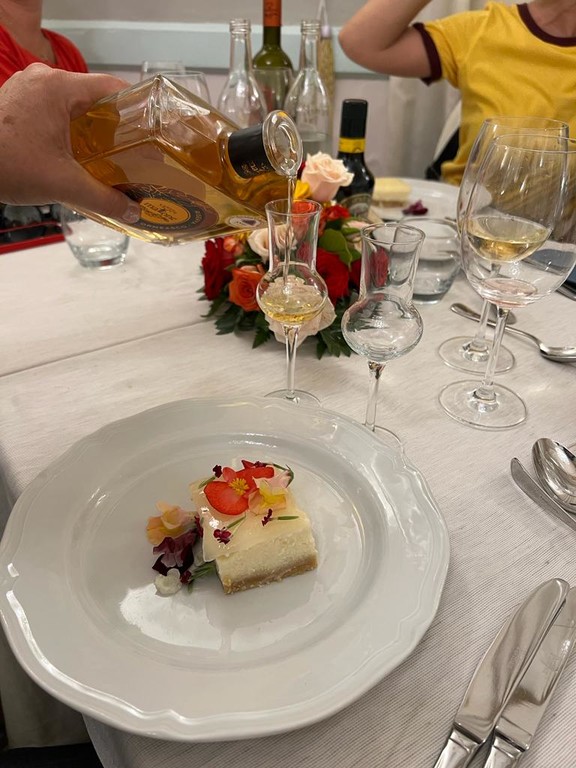 La Dinner With The Ambassadors Of Ligurian Food si è conclusa con una torta agli agrumi abbinata a una degustazione di Grappa di Ormeasco – Riserva - Gran Medaglia D’Oro a “Grappa Award” 2022 sempre della Tenuta Maffone.