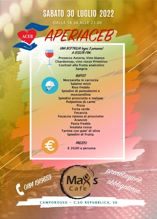 Sabato prossimo dalle ore 18.30 alle ore 23.00, si terrà un’apericena con ricco menù denominata 'AperiAceb', a favore dell'Aceb, presso il bar Max’s Caffè in corso Repubblica 36 a Camporosso, accanto al distributore di benzina).