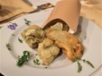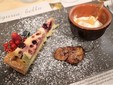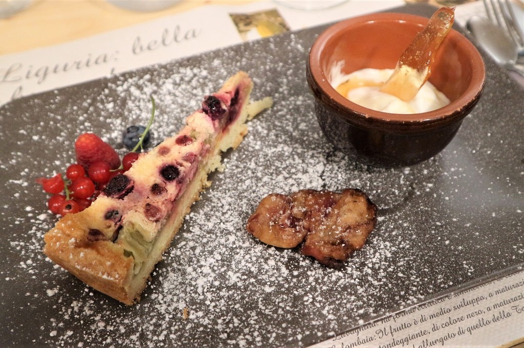 Proposte interessanti anche con la carne, come il coniglio, ovviamente in una originale versione alla ligure, ma anche rostelle e filetti alla griglia abbinati alle verdure di stagione o ai funghi. Con i fiori raccolti nelle campagne o provenienti dalla coltivazione biologica di Ravera Bio di Albenga, Alessandro crea dei sorbetti alla begonia squisiti, dei frisceu di petali di rosa, che serve in abbinamento alla torta di Rabarbaro, coltivato direttamente dallo chef nell’orto di famiglia, e uno squisito gelato di finto miele di tarassaco. I dolci sono assolutamente da provare.