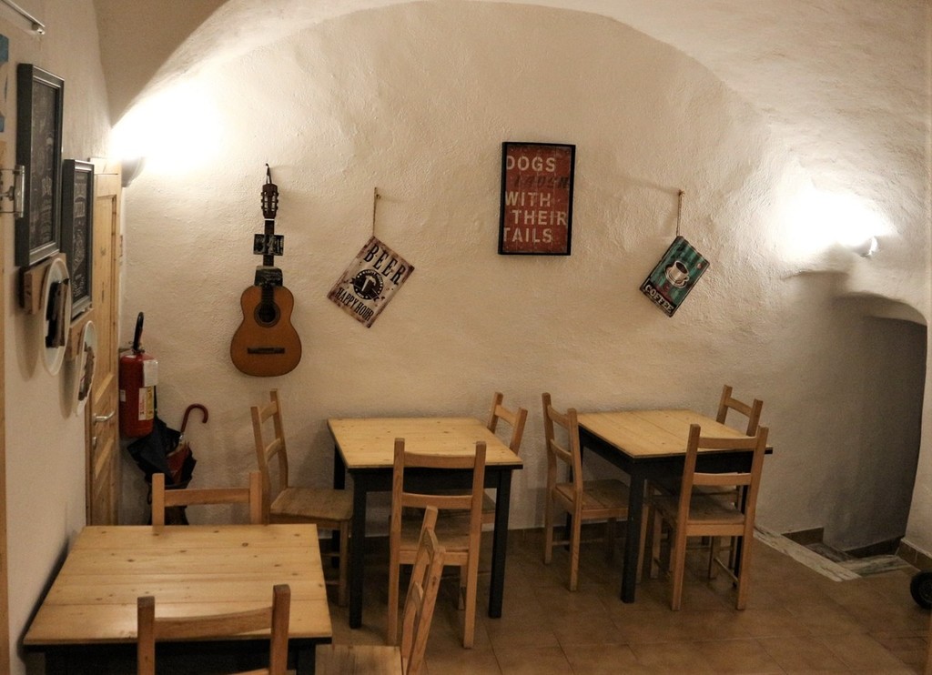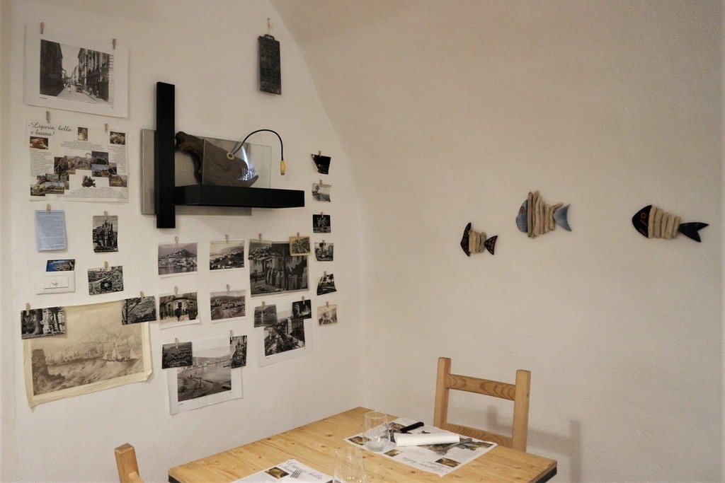 L’ambiente è molto raccolto ed accogliente, l’arredamento di legno, le pareti in pietra e le lavagnette in ardesia e legno, rendono l’ambiente rustico ed informale. Appesi nelle due sale rallegrano l’ambiente piccole opere d’arte, create da Alessandro e Lucia, in legno recuperato dal mare nelle forme di pesci colorati e curiosi, come un’insolita lampada inserita nelle fauci di un piranha.