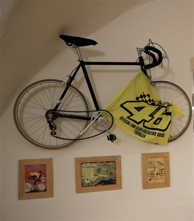In un’altra parete è appesa una piccola bici da corsa che ci ricorda che proprio il Poggio di Sanremo è famoso per i suoi tornanti con vista fantastica sul mare e che spesso determinano il vincitore della corsa Milano-Sanremo.