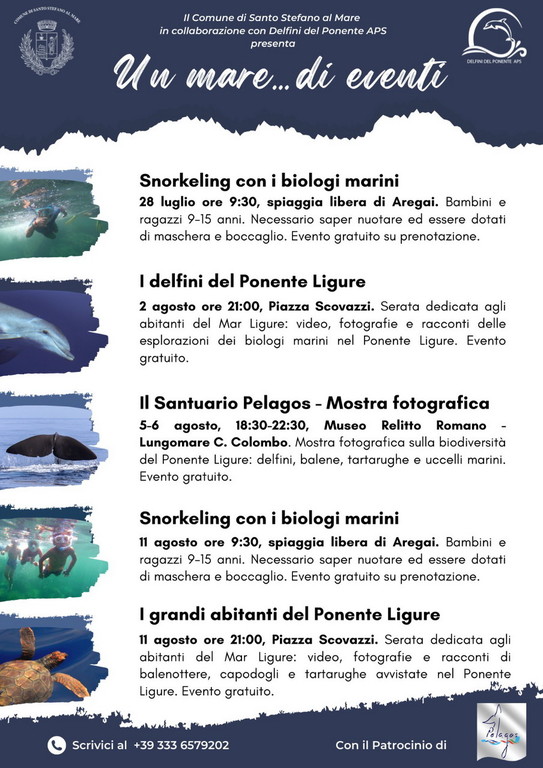 L'Amministrazione di Santo Stefano al Mare, in collaborazione con l'Associazione Delfini del Ponente APS propone 'Un Mare di...eventi', una serie di eventi dedicati al mar ligure, una risorsa unica e preziosa che circonda il nostro territorio.
