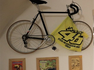 In un’altra parete è appesa una piccola bici da corsa che ci ricorda che proprio il Poggio di Sanremo è famoso per i suoi tornanti con vista fantastica sul mare e che spesso determinano il vincitore della corsa Milano-Sanremo.