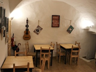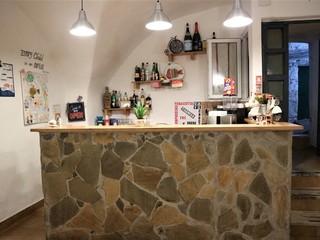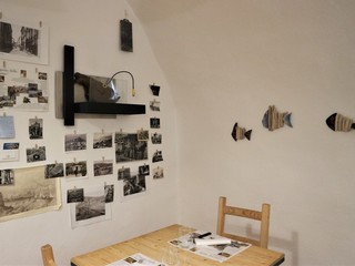 L’ambiente è molto raccolto ed accogliente, l’arredamento di legno, le pareti in pietra e le lavagnette in ardesia e legno, rendono l’ambiente rustico ed informale. Appesi nelle due sale rallegrano l’ambiente piccole opere d’arte, create da Alessandro e Lucia, in legno recuperato dal mare nelle forme di pesci colorati e curiosi, come un’insolita lampada inserita nelle fauci di un piranha.