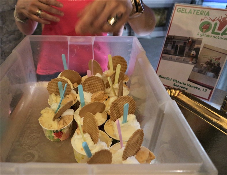 Come tradizione della manifestazione è stata offerta una degustazione organizzata dalla Cna di Imperia, che in questa occasione ha proposto il gelato naturale della Gelateria Ola di Sanremo preparato con frutta a lm zero: un tris di limone, pesca e albicocca che ha deliziato il pubblico presente.