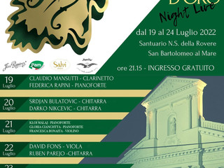 Si avvia rapidamente verso la fase finale il XXXIII Concorso Internazionale di Esecuzione Strumentale "Giovani Talenti" e "Premio Rovere d’Oro 2022" (Direttore artistico Christian Lavernier), che si svolge a San Bartolomeo al Mare (Sagrato del Santuario di N. S. della Rovere) fino a domenica 24 luglio. Oggi sono in programma le fasi eliminatorie del Rovere d'Oro e domani ci saranno le fasi finali, con la finalissima in forma di concerto serale, durante il quale i migliori classificati si esibiranno uno dopo l’altro, con il pubblico che sarà chiamato ad esprimere la propria preferenza.