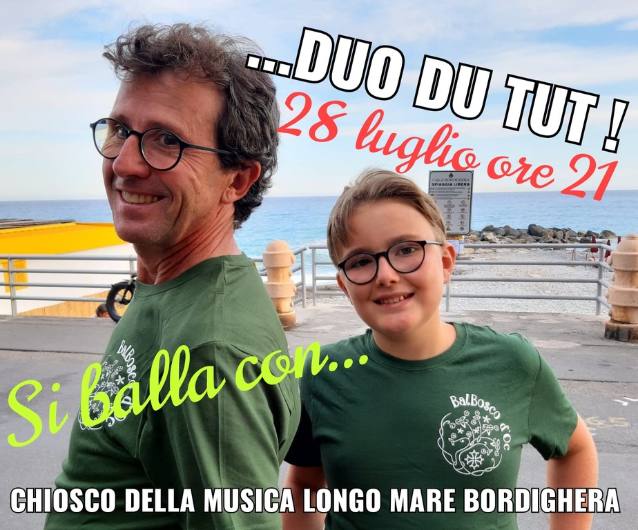 L'associazione Balbosco D'Oc, da anni impegnata nella diffusione della musica e delle tradizioni popolari occitane e folk, organizza a partire dalle ore 21.00 presso il suggestivo Chiosco della Musica di Bordighera una serata di danze ed ascolto di buona musica occitana in compagnia del duo composto da Marco alla fisarmonica e il giovanissimo fisarmonicista Matteo Orsini, in arte i ‘Du Tut’. Il duo riserverà molte sorprese positive. Si entra gratuitamente, si esce a ‘Chapeau’.