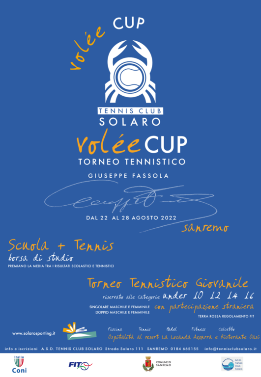 Si ricorda che sono aperte le iscrizioni al “Torneo Tennistico Giovanile con Borsa di studio Volée Cup”. Giunto alla sesta edizione, il Torneo evoca la figura di Pino Fassola, fondatore del Tennis Club Solaro e del Resort Solaro Sporting Club.