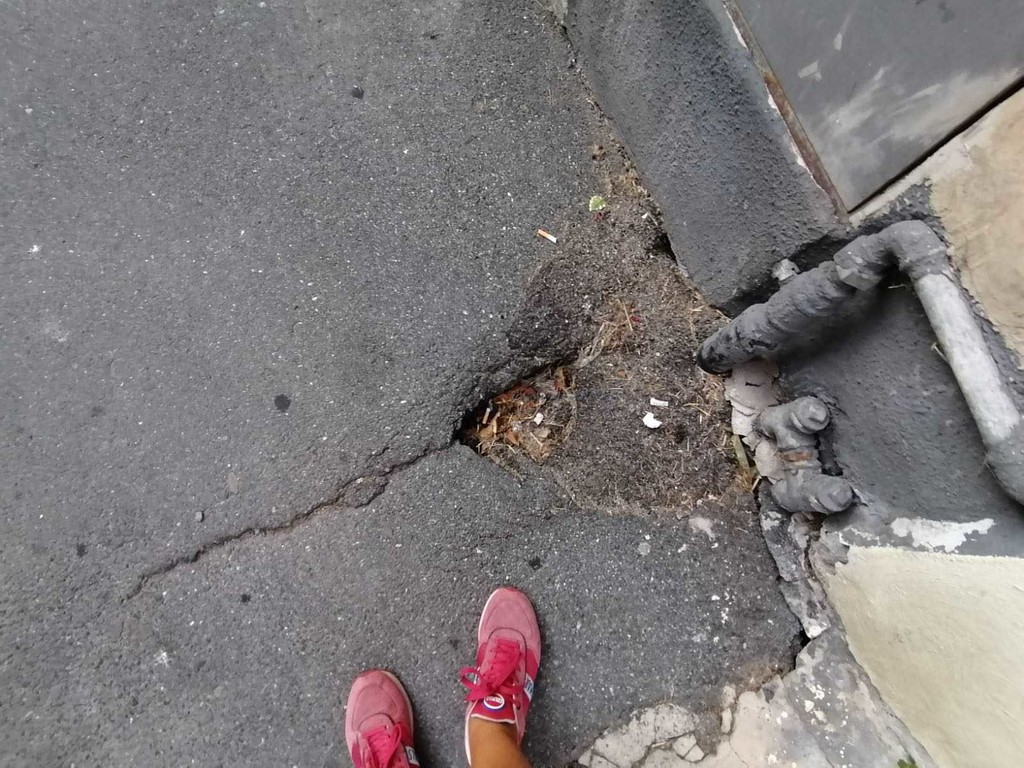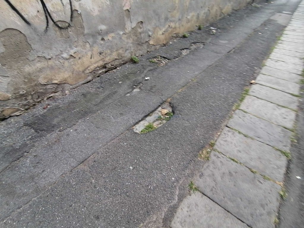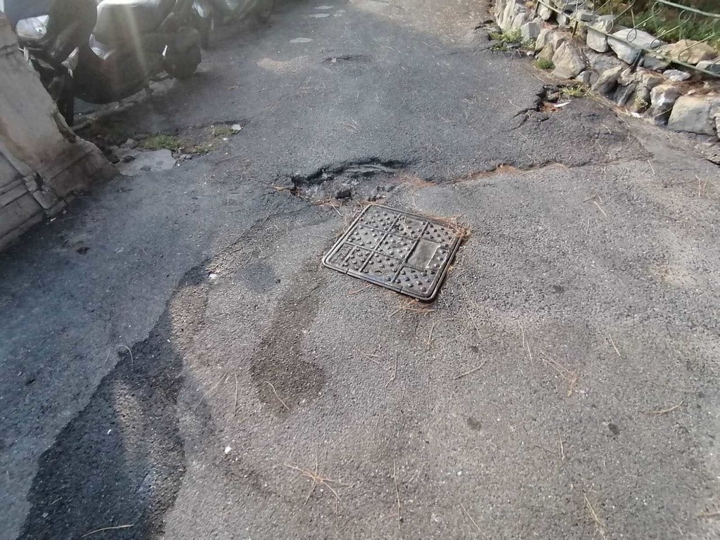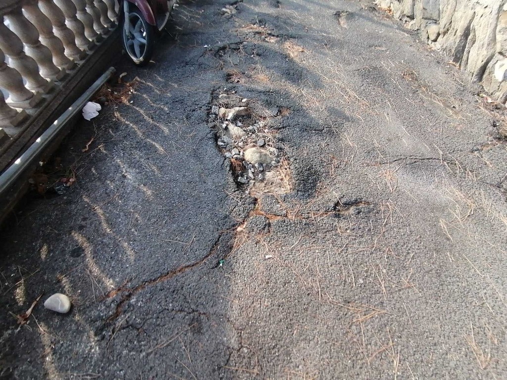 L’asfalto è un colabrodo tanto da far riemergere la pavimentazione sottostante; ci sono anche buchi che rappresentano un pericolo non da poco in una zona pedonale attraversata ogni giorno da molte persone specie durante l’anno scolastico.