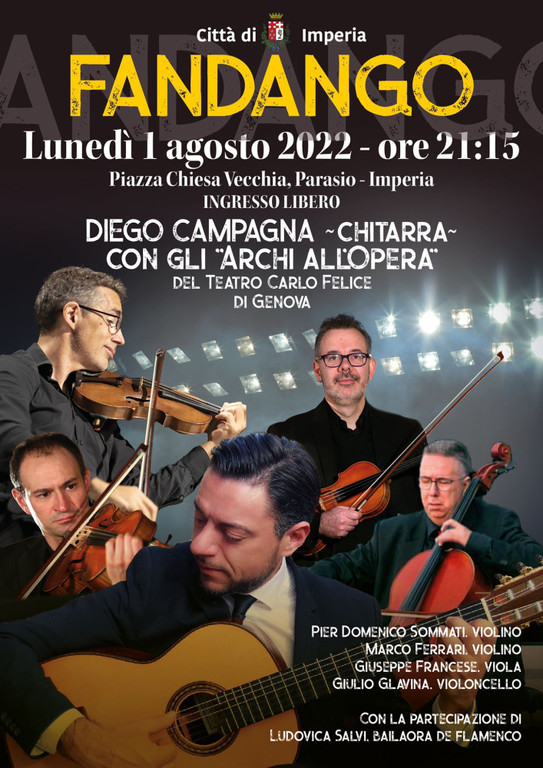 Per “Fandango”, questo il titolo del concerto, Diego Campagna sarà accompagnato dagli Archi all’Opera, Ensemble del Teatro Carlo Felice di Genova. Sarà un viaggio in musica che vedrà dialogare la chitarra con il quartetto d’archi attraverso epoche, stili e voci autorali molto diversi tra loro.