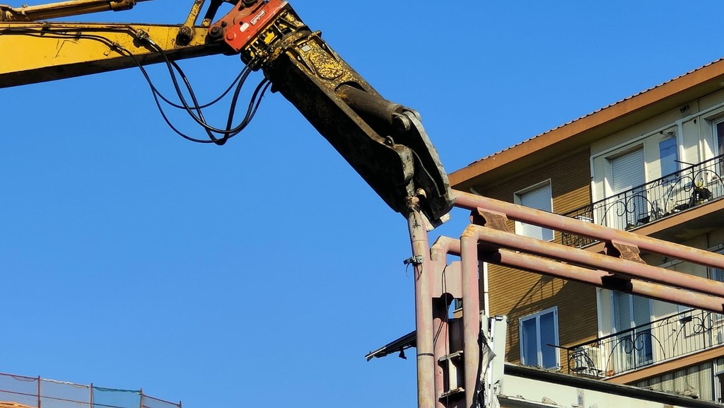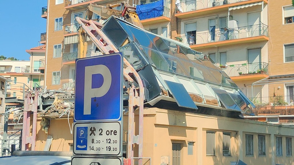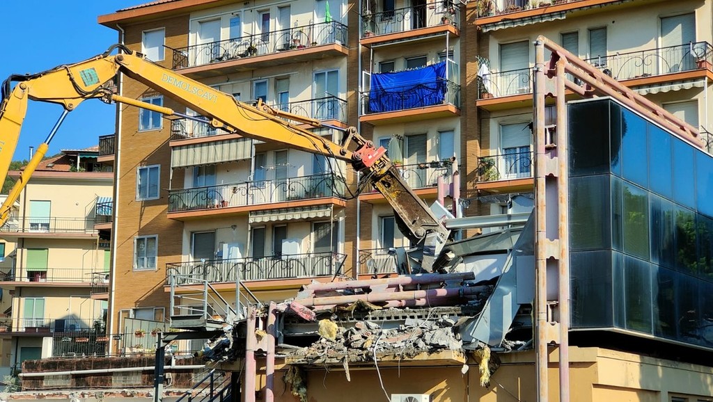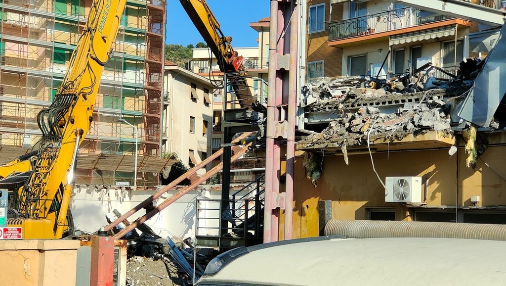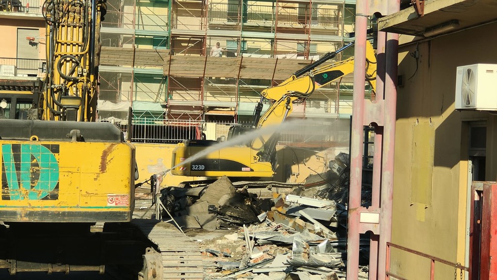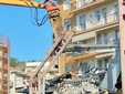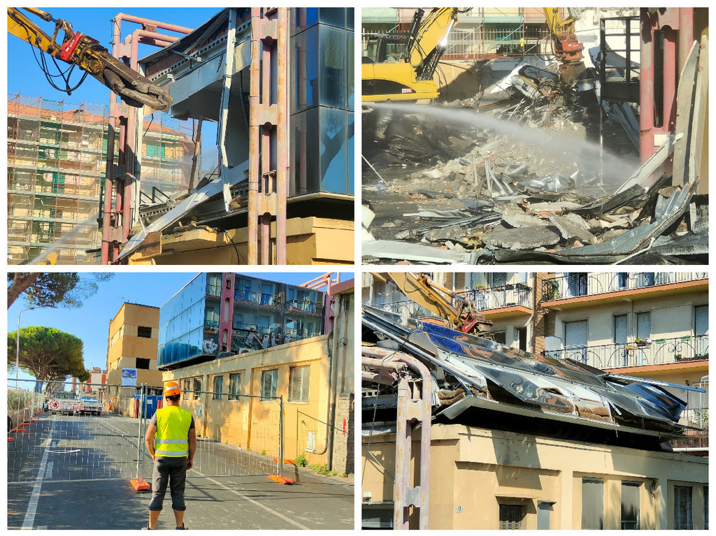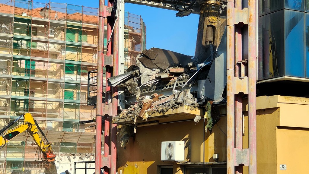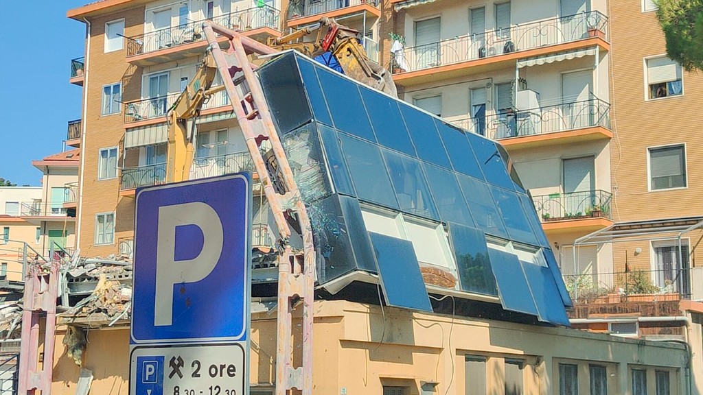 La benna ha terminato l’abbattimento della palazzina in vetro. Traffico deviato