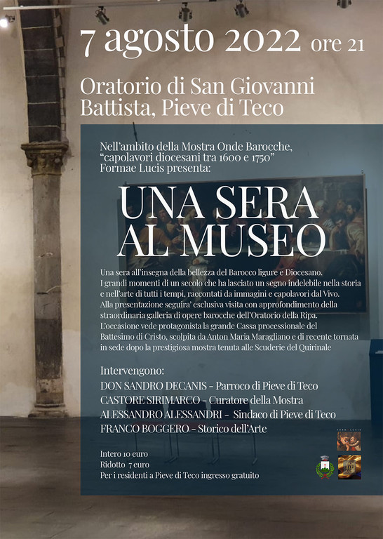 Nell’ambito della Mostra “Onde Barocche, capolavori diocesani tra 1600 e 1750” Formae lucis presenta: Una sera al Museo, in programma domenica 7 agosto alle 21.00 all’Oratorio di San Giovanni Battista di Pieve di Teco. Una sera all’insegna della bellezza del Barocco ligure e Diocesano che vedrà protagonista la grande cassa processionale del Battesimo di Cristo, scolpita da Anton Maria Maragliano, statua lignea, datata 1698 e conservata nell’oratorio di San Giovanni Battista di Pieve di Teco. L’opera è di recente tornata in sede dopo essere stata esposta alla prestigiosa mostra dedicata al barocco alle Scuderie del Quirinale di Roma Superbarocco. Arte a Genova da Rubens a Magnasco. Oltre all’opera del Maragliano, protagonista della mostra romana è stato anche le Tentazioni di Sant’Antonio Abate (1652 circa), di Giulio Benso, opera proveniente dalla chiesa della Madonna della Ripa di Pieve di Teco