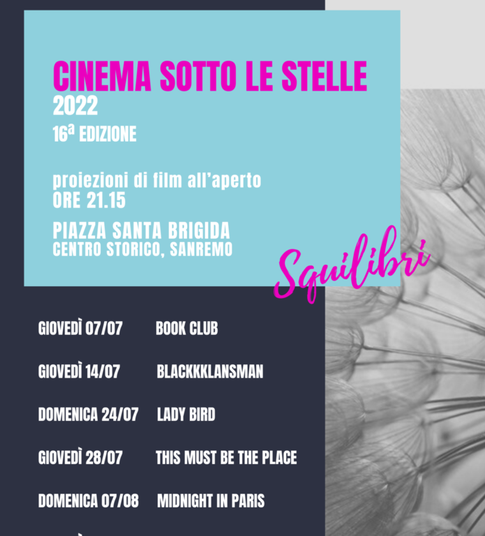 Il “Cinema sotto le stelle” è organizzato dall’Associazione Pigna Mon Amour e da Coop. CMC/Nidodiragno Produzioni e sostenuto dal contributo economico del Comune di Sanremo. Il settimo e ultimo appuntamento sarà giovedì 25 agosto con la proiezione del film “L’uomo che non c’era”.
