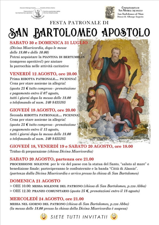Sono iniziati a San Bartolomeo al Mare i festeggiamenti in onore del Santo Patrono, San Bartolomeo Apostolo. Dopo la prima e la seconda Ribotta Patronale Picenina (cene di allegria e condivisione, organizzate dal Centro Pastorale e dalla Confraternita il 12 e il 18 agosto) San Bartolomeo Apostolo verrà celebrato sabato 20 agosto con la Processione Solenne per le vie del paese con la statua del Santo, il “saluto al mare” e la benedizione finale; parteciperanno le Confraternite e la Banda “Città di Alassio”. La partenza è fissata alle ore 21.00 dalla Chiesa della Divina Misericordia mentre l'arrivo è previsto presso la Chiesa di San Bartolomeo.