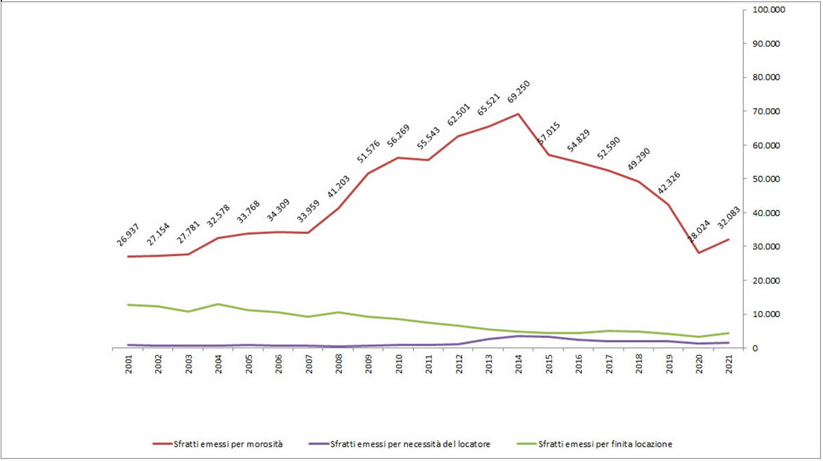Dopo un anno difficile e che ha segnato il blocco dell’esecuzione degli sfratti, i numeri tornano quasi “naturalmente” a salire. I numeri bassi del 2020, infatti, non raccontano di una quantità ridotta di inquilini che si trovano in condizione di morosità nei confronti del proprietario (magari fosse stato così!), ma di una situazione di stallo che si è creata in conseguenza del blocco imposto dal governo come misura urgente per contrastare proprio una situazione sempre più diffusa di morosità e difficoltà vissuta dagli inquilini, così come da tutti i cittadini, a causa dell’emergenza del Coronavirus. Il blocco delle udienze nei tribunali italiani durante una parte significativa del 2020, oltre ai vari provvedimenti di finanziamento di fondi per il pagamento dell’affitto previsti dal governo durante i mesi del lockdown, aveva generato una situazione di paralisi.