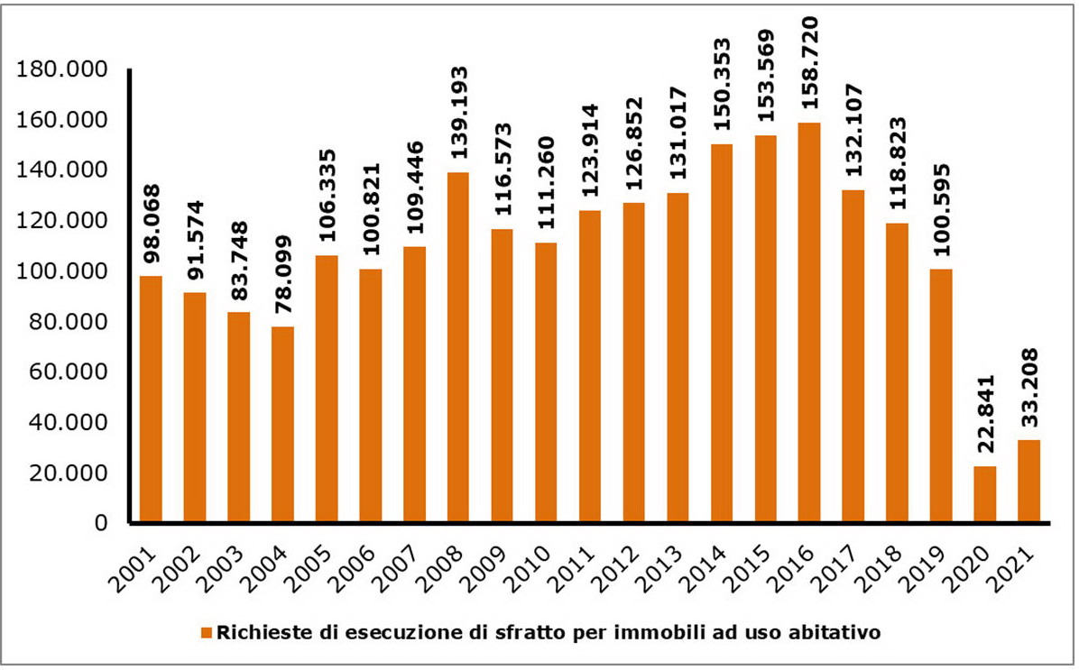 • a livello di richieste di esecuzione di sfratto siamo ancora molto lontani dai valori pre covid, ma molto al di sopra rispetto al 2020 (quasi 68% in più): il numero ridotto è ancora riconducibile al blocco delle esecuzioni che il governo aveva prolungato per tutto il 2020.