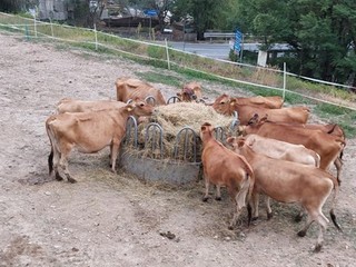 Le vacche sono quindi allevate all’aperto nei dintorni della stalla, dove hanno la possibilità di rientrare in caso di maltempo. All’esterno possono abbeverarsi con acqua corrente e brucare il fieno mantenuto asciutto e salubre attraverso porta-rotoballe dotate di copertura. All’interno della stalla sono stati destinati spazi a “sala parto”, dove le vacche vengono tenute anche i giorni immediatamente successivi al parto, insieme al vitellino, per garantire ai neonati l’allattamento iniziale dalla madre. I muri perimetrali interni ed esterni sono ricoperti da grandi spazzole, utilizzate con evidente diletto dalle vacche per massaggiarsi