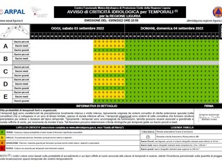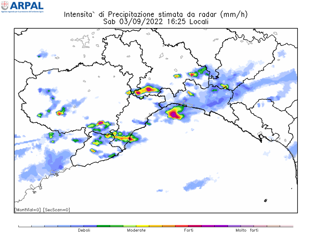 "Si segnalano intensità molto forti a Madonna delle Grazie (Genova) con 55.2 millimetri in un’ora, Lerca (Cogoleto, Genova) con 52.2 di cui 31.4 in 15 minuti, Sciarborasca (Cogoleto, Genova) con 50.8; intensità forti a Santa Margherita Ligure (Genova) con 48.4 millimetri in un’oradi cui 26.6 in 15 minuti. Alpe Vobbia (Genova) con 40.2, Monte Pennello (Genova) con 30.0. Al momento è Madonna delle Grazie ad avere la cumulata totale maggiore con 78.8 millimetri" - analizzano da Arpal.